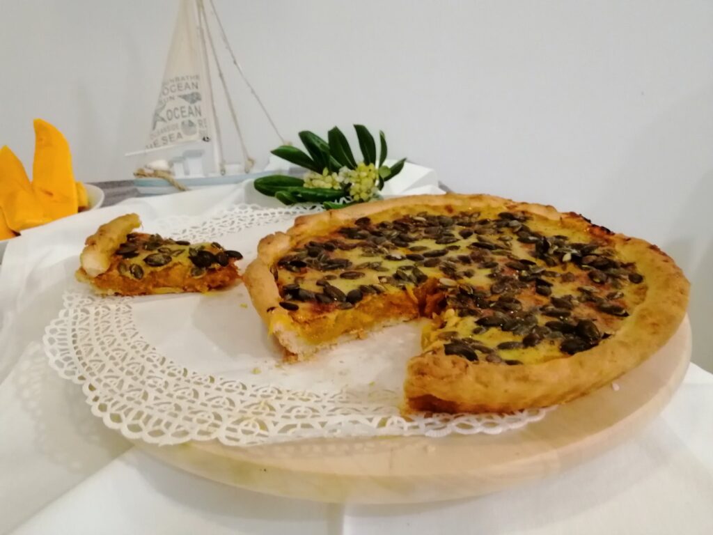 Moko zmešamo s pecilnim praškom in dodamo narezano hladno maslo. Zmes z rokami zdrobimo v maslene drobtine. Vmešamo maskarpone in zavijemo testo v folijo, da počiva eno uro v hladilniku. Očiščeno bučo narežemo na kocke in jo soparimo 15 minut, nato jo stresemo v pekač, premažemo s cvetličnim medom in potresemo s cimetom. Zmes pečemo na 170 °C. Po 30 minutah pretresemo v skledo, zmečkamo kot za pire, dodamo jajci in sladko smetano. V ponvi prepražimo bučna semena in jih odstavimo za kasneje. Iz hladilnika vzamemo testo, ga razvaljamo v krog in ga postavimo na nizek okrogel model za pito. Rahlo potlačimo, da testo objame stene pekača, nato čez pekač potegnemo z valjarjem, da odpade odvečno testo, ki ga pregnetemo in shranimo za pozneje. Osnovo za pito v pekaču prebodemo z vilicami in pečemo 10 minut na 180 °C. Pečeno osnovo vzamemo iz pečice in napolnimo z nadevom. Iz testa, ki nam je ostalo, naredimo svaljek in oblikujemo dodaten rob ob pekaču, nato potresemo z bučnimi semeni, ki smo jih prej prepražili, ter pečemo na 180 °C 30–35 minut.