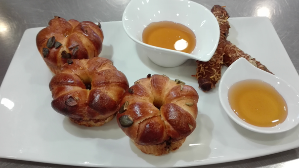 Iz kroglic z valjanjem oblikujemo pravokotnike, ki jih na eni strani vsak centimeter prerežemo, vendar ne do konca. Na celo stran damo nadev, po razrezanem delu pa premažemo z maslom in začnemo zvijati v rulado. Pazimo, da je zaključek spodaj. Na koncu rulado zvijemo v klobčič, ter damo v model za mafine, ki smo ga namastili ali pa obložili s papirjem za peko. Izdelek vzhajamo, da naraste, premažemo z jajčnim rumenjakom in posipamo z grobo nasekljanimi bučnimi semeni. 10 – 12 minut pečemo pri 220 °C, ko pa so pečeni, jih premažemo s medom in sredino napolnimo z medom. To naredimo po pečenju predvsem zato, da med ohrani svojo zdravilno hranilno sestavo, saj z visoko termično obdelavo v medu uničimo precej zdravilnih hranil.