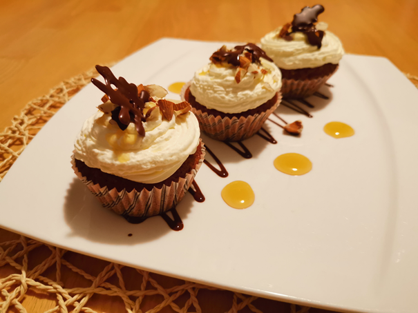 V pekač za mafine položimo papirnate posodice. S pripravljeno maso napolnimo modelčke do ¾. Pečemo v pečici, ogreti na 180 stopinj C približno 20 minut.