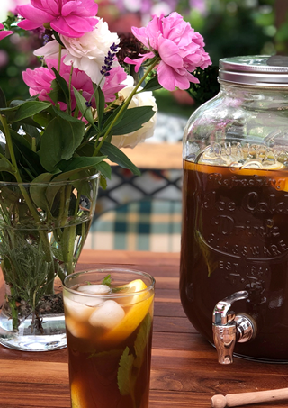 2 litra vode, 80g svetlejšega medu (priporočljivo lipovega), 8 žlic aromatiziranega črnega čaja (najbolje z aromo sadja ali cvetlic, lahko zamenjamo tudi z roibooshem, če želimo, da je brez kofeina), 3 limone, šopek mete.