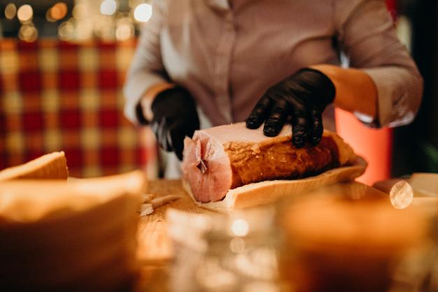 Pečeno šunko pokrijte s krpo, jo ohladite in šele nato postrezite. Šunka naj bo narezana na pol cm debele rezine. Poleg servirajte tudi nalomljen kruh, v katerem se je šunka pekla, in po želji še jabolčni ali jajčni hren.